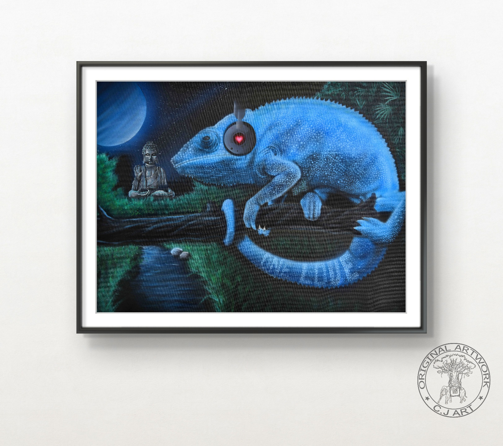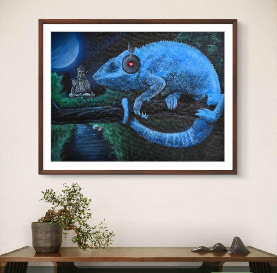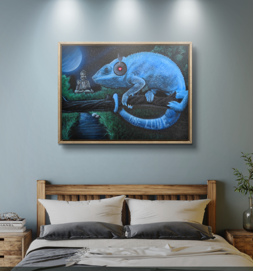 Et kunstprint af C J’s orginale maleri “The Blue Chameleon”. Et værk spækket med detaljer og et farverigt budskab som vil pryde ethvert hjem. Kamæleonen har evnen til at skifte farve og kamuflere sig i de fleste omgivelser, men denne kamæleon skiller sig ud med sin smukke blå farve, som den tilegner sig fra måneskinnet. Billedet illustrere bla. vigtigheden i at turde lytte til sit hjerte, selvom det vil betyde at skille sig ud fra omgivelserne.