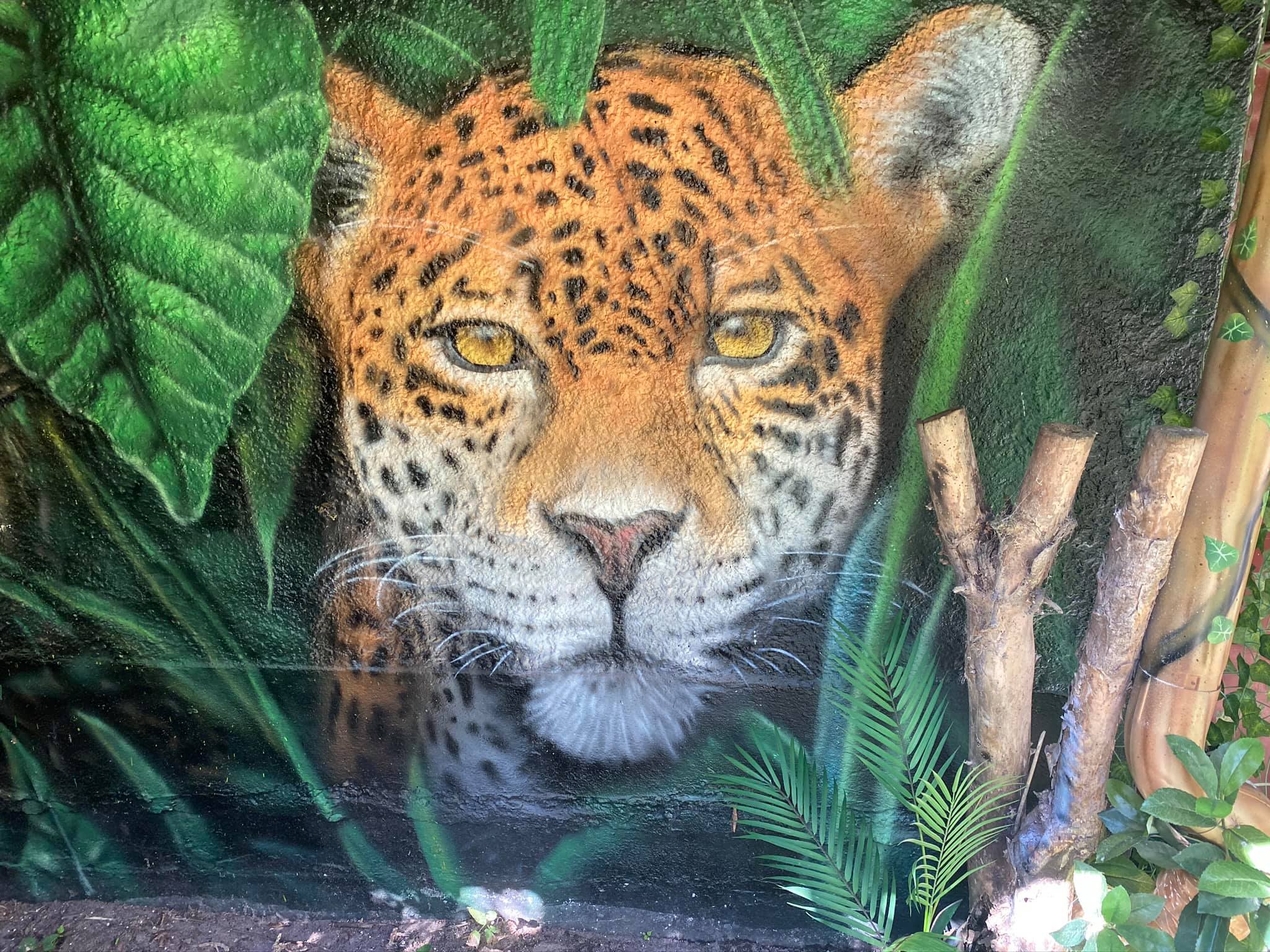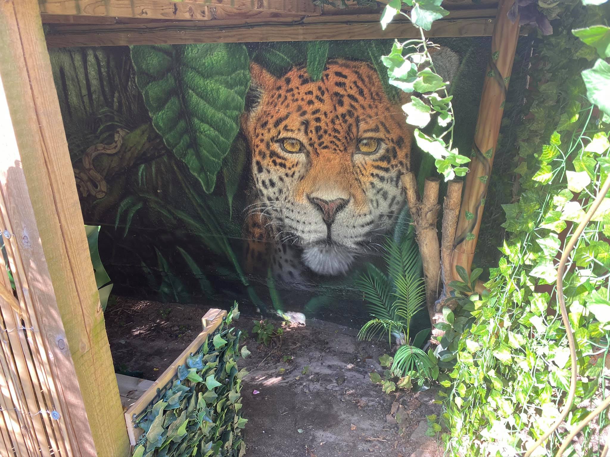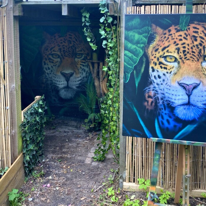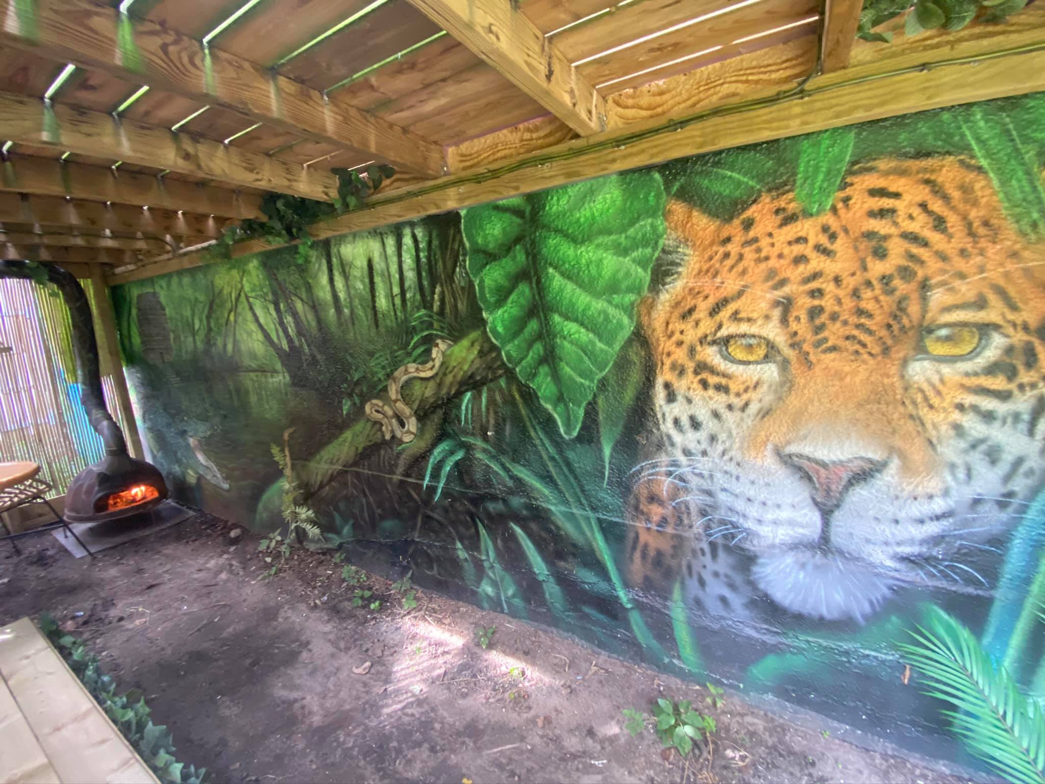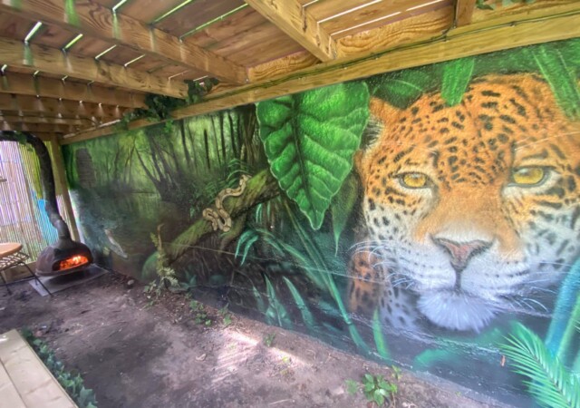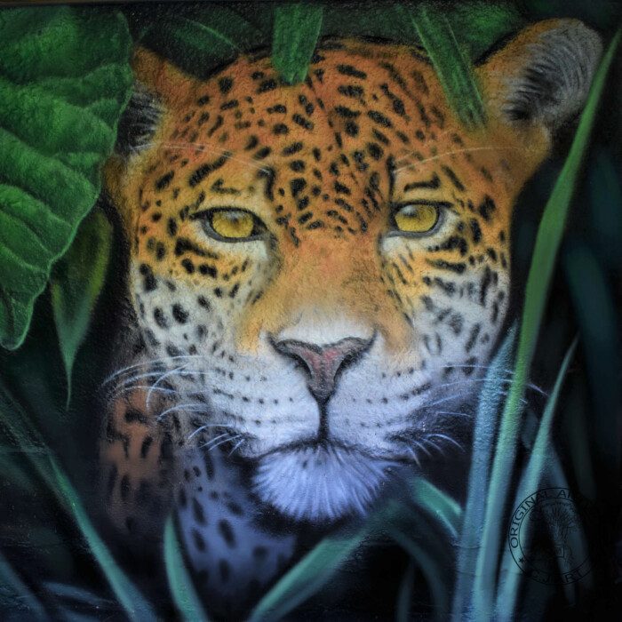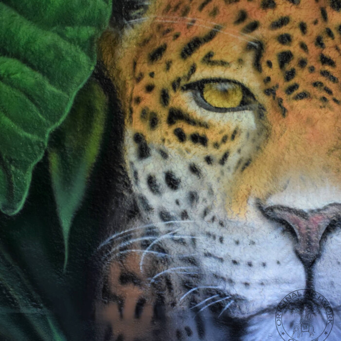 “”Jaguarens hule” var mit sommer projekt i sommeren 2020. Tænkte jeg ville prøve at gøre min kunst, til en lidt mere fordybende oplevelse. Værket i sig selv bærer også et budskab. Jaguaren som vogter indgangen til hulen, kan virke intimiderende, og er et kæmpe symbol i gammel Sydamerikansk kultur. Den repræsentere bl.a. styrken til at overkomme sin frygt. Frygten kan have mange ansigter. ikke alene frygten for at blive spist af en Jaguar eller bidt af en slange, men også frygten for hvad andre folk tænker, frygten for at fejle, frygten for ikke at være god nok eller frygt for forandring. Frygt kan være den største hindring vi har, for at udleve vores drømme. De bedste oplevelser i livet, kommer som regel med et mægtigt sus i maven inden og når det så er overstået, står man beriget med en fed oplevelse og tanken om hvad man egentlig var så bange for?”
