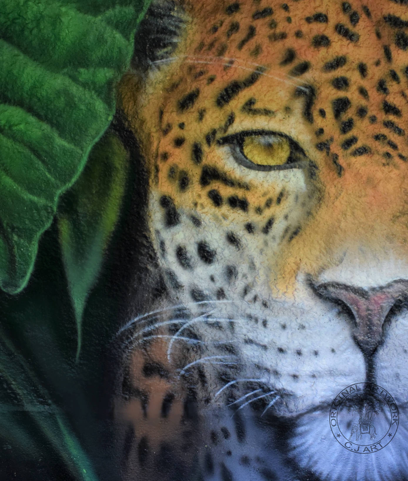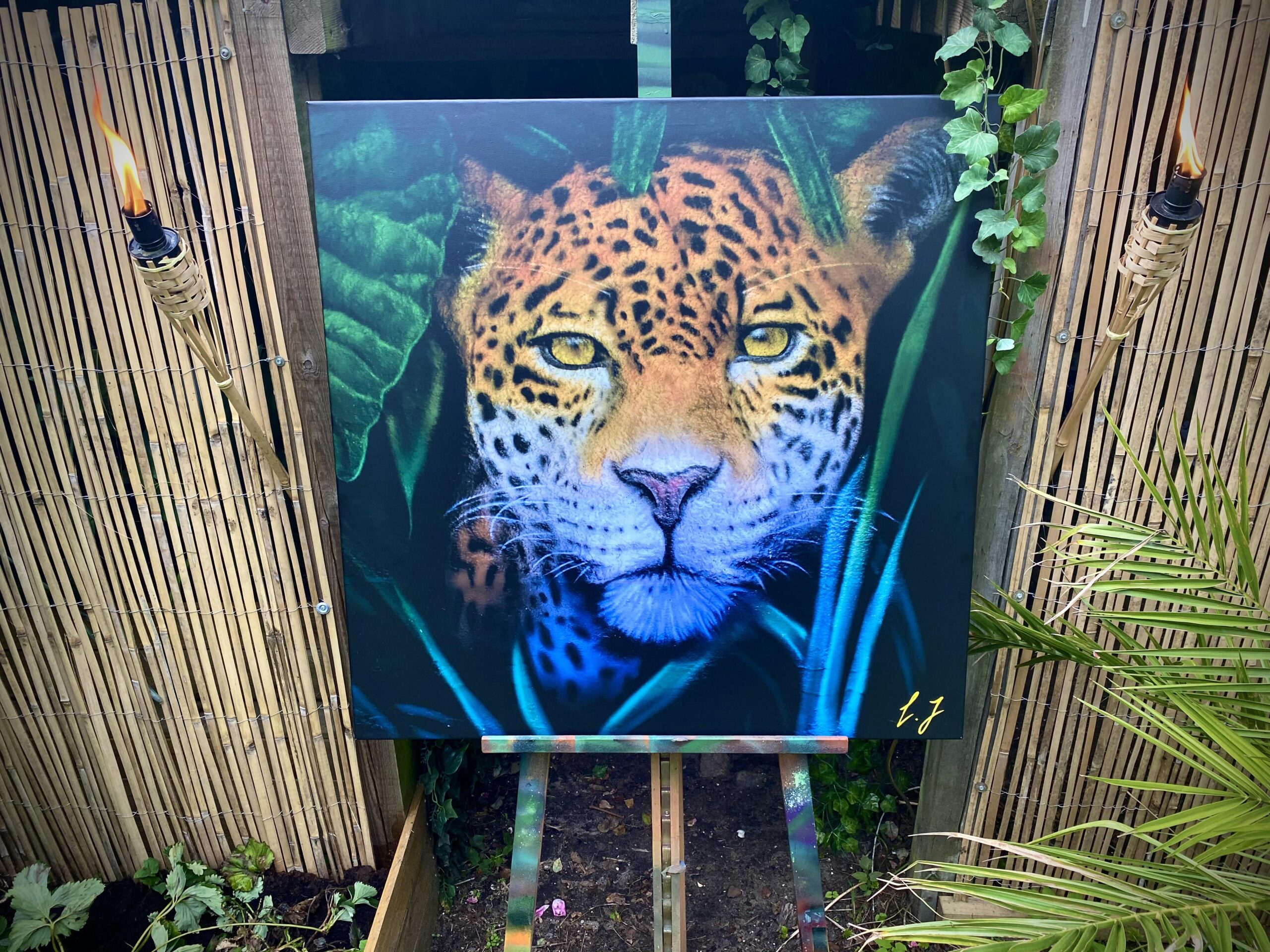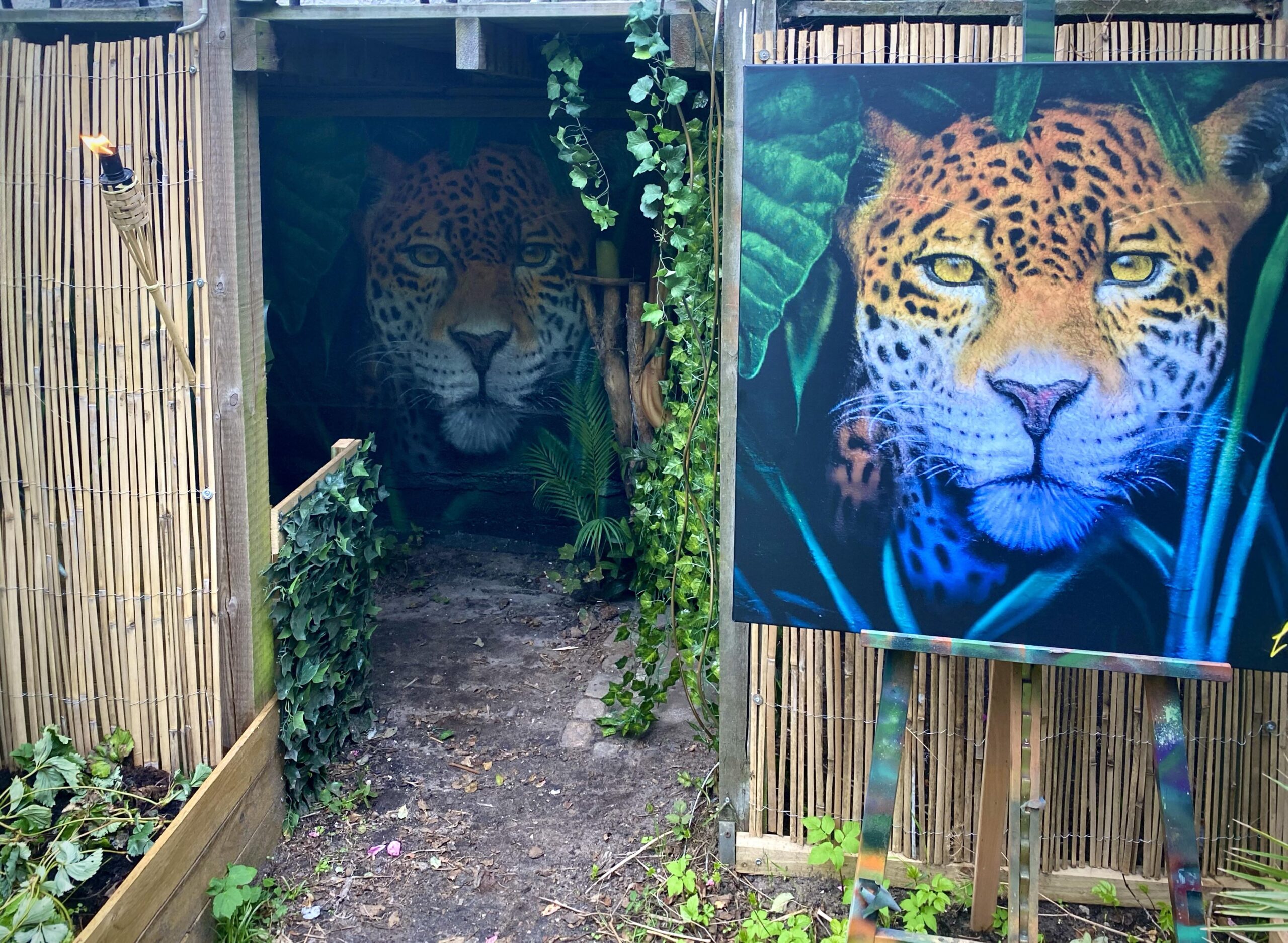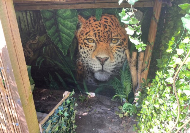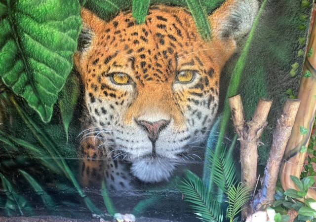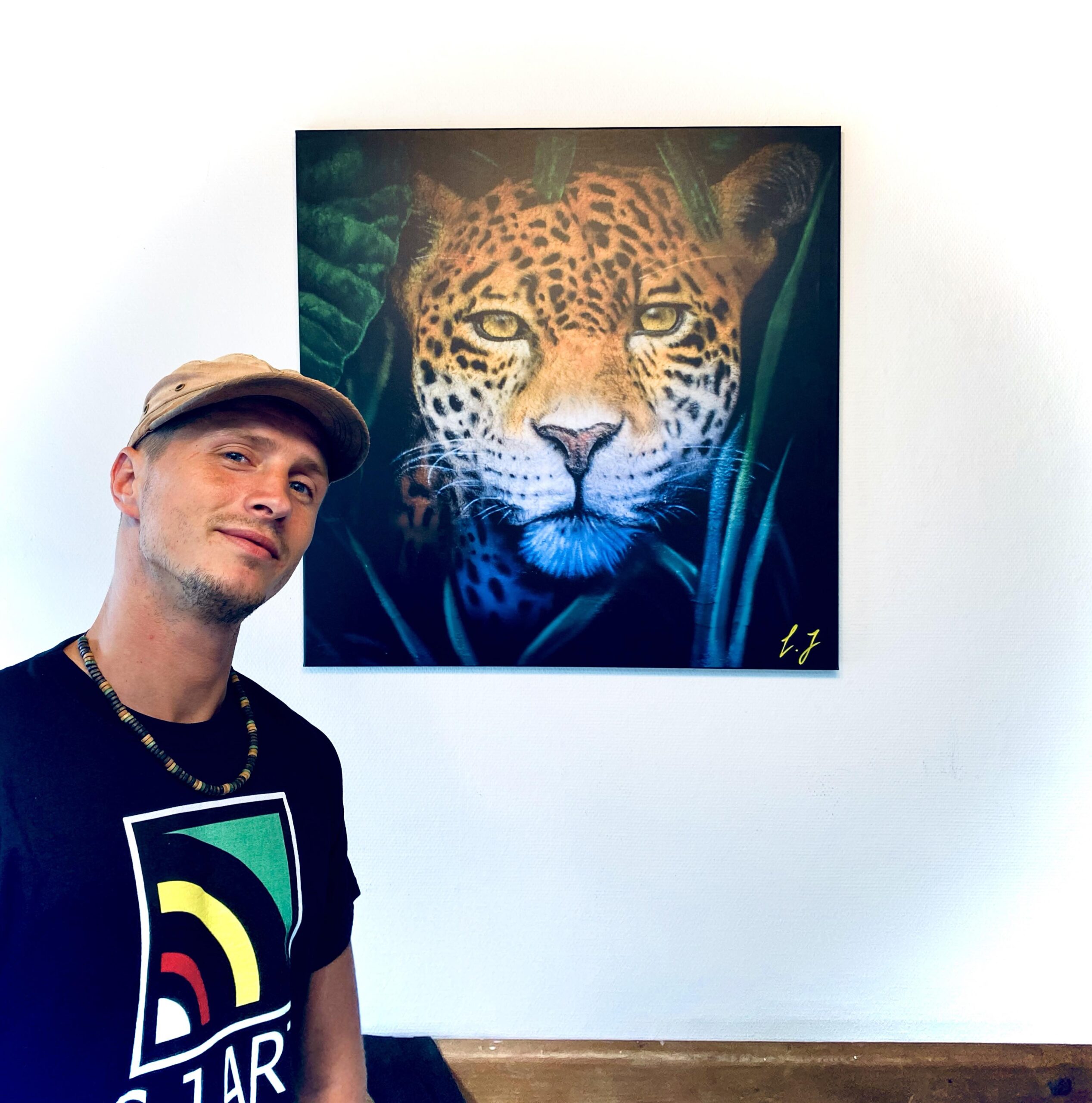 “”Jaguarens hule” var mit sommer projekt i sommeren 2020. Tænkte jeg ville prøve at gøre min kunst, til en lidt mere fordybende oplevelse. Værket i sig selv bærer også et budskab. Jaguaren som vogter indgangen til hulen, kan virke intimiderende, og er et kæmpe symbol i gammel Sydamerikansk kultur. Den repræsentere bl.a. styrken til at overkomme sin frygt. Frygten kan have mange ansigter. ikke alene frygten for at blive spist af en Jaguar eller bidt af en slange, men også frygten for hvad andre folk tænker, frygten for at fejle, frygten for ikke at være god nok eller frygt for forandring. Frygt kan være den største hindring vi har, for at udleve vores drømme. De bedste oplevelser i livet, kommer som regel med et mægtigt sus i maven inden og når det så er overstået, står man beriget med en fed oplevelse og tanken om hvad man egentlig var så bange for?”