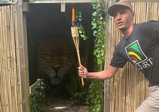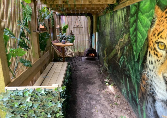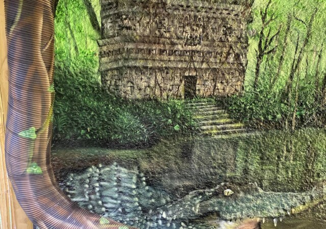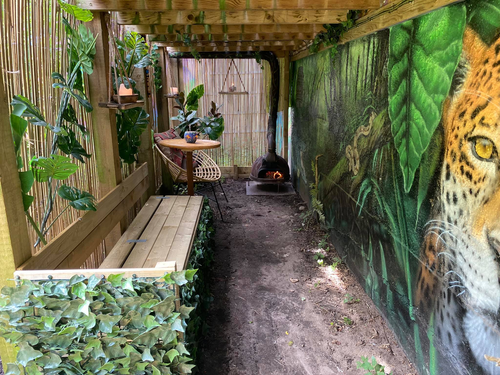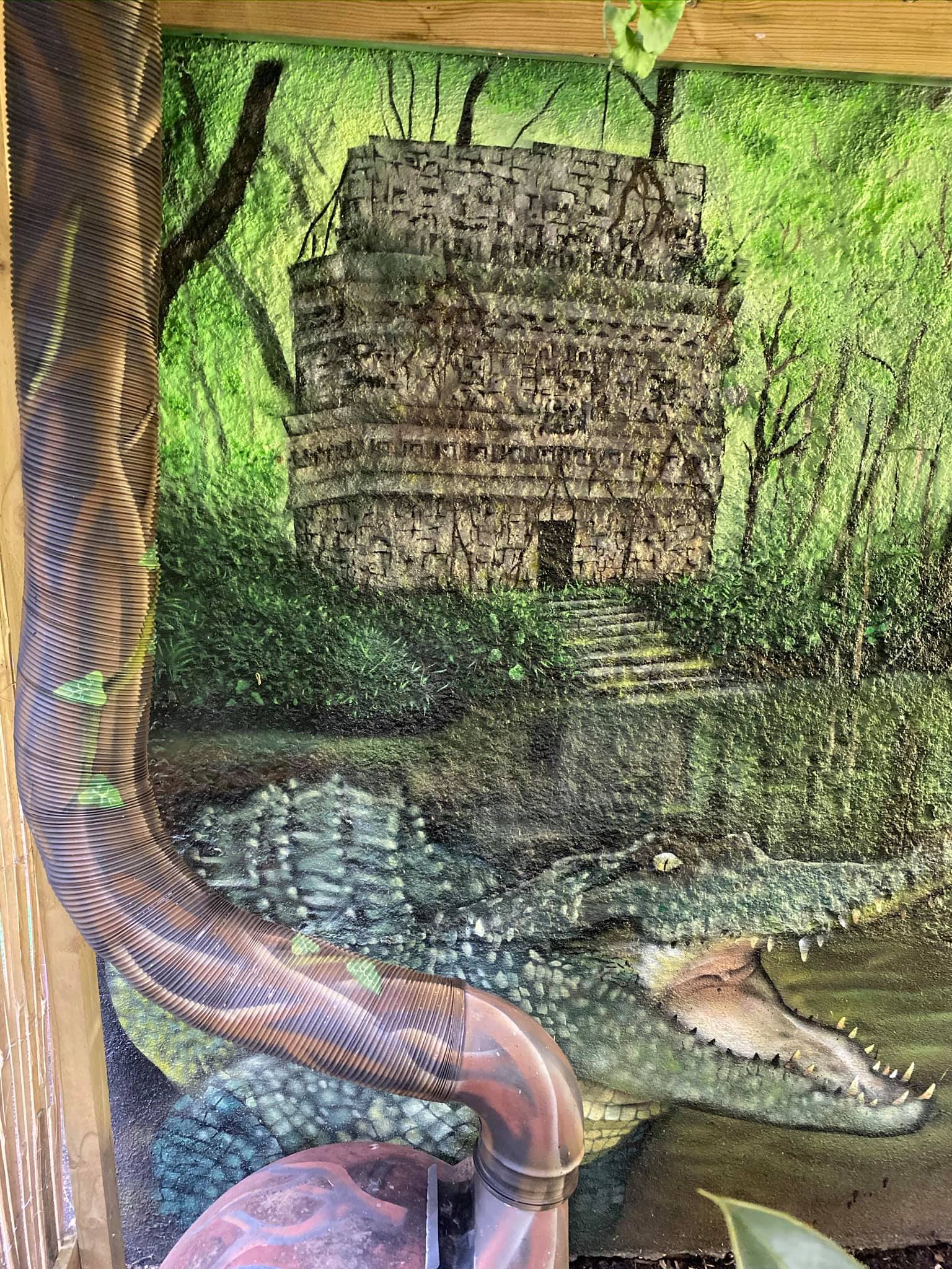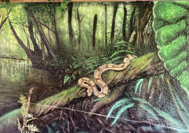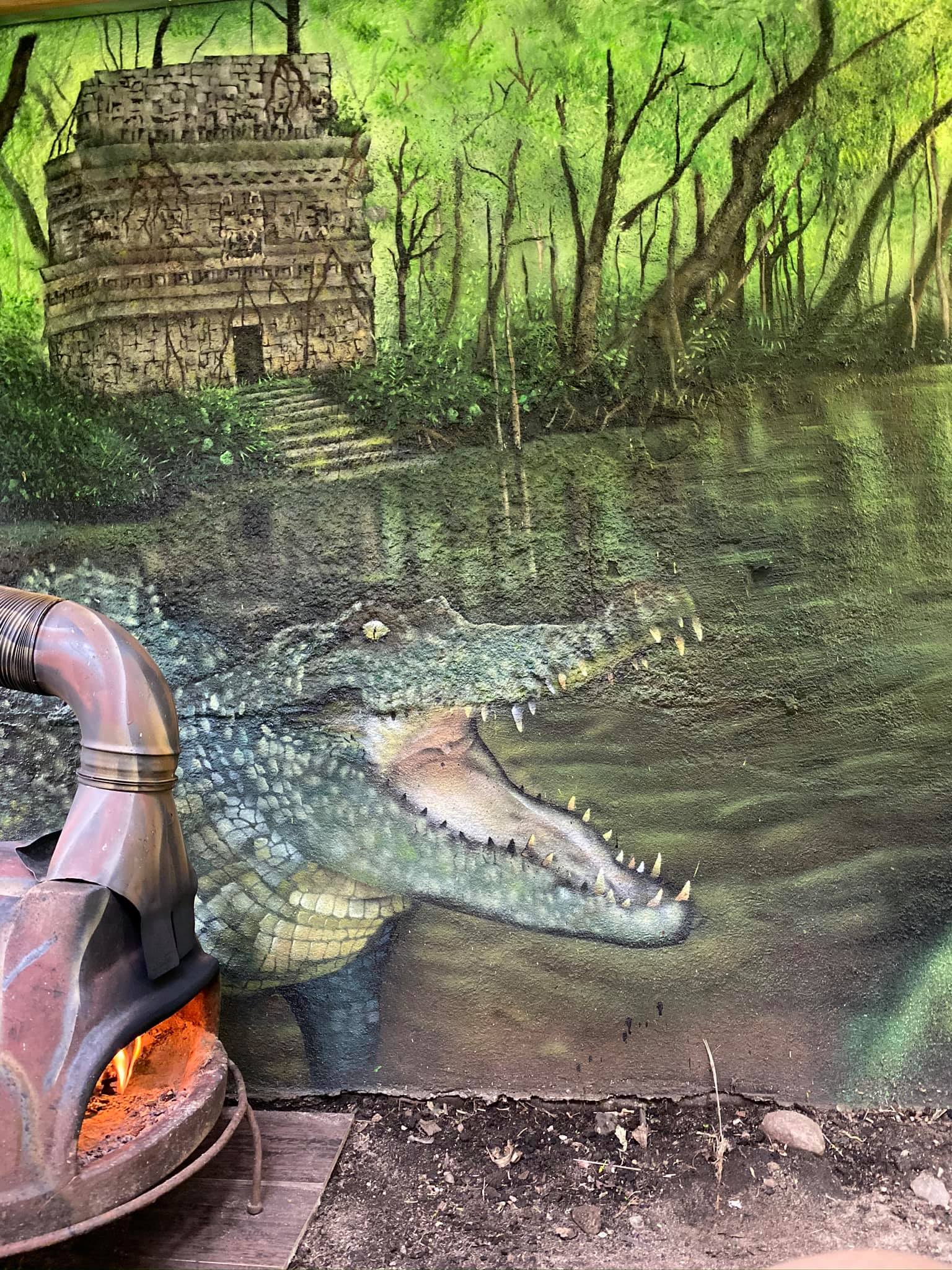 “”Jaguarens hule” var mit sommer projekt i sommeren 2020. Tænkte jeg ville prøve at gøre min kunst, til en lidt mere fordybende oplevelse. Værket i sig selv bærer også et budskab. Jaguaren som vogter indgangen til hulen, kan virke intimiderende, og er et kæmpe symbol i gammel Sydamerikansk kultur. Den repræsentere bl.a. styrken til at overkomme sin frygt. Frygten kan have mange ansigter. ikke alene frygten for at blive spist af en Jaguar eller bidt af en slange, men også frygten for hvad andre folk tænker, frygten for at fejle, frygten for ikke at være god nok eller frygt for forandring. Frygt kan være den største hindring vi har, for at udleve vores drømme. De bedste oplevelser i livet, kommer som regel med et mægtigt sus i maven inden og når det så er overstået, står man beriget med en fed oplevelse og tanken om hvad man egentlig var så bange for?”