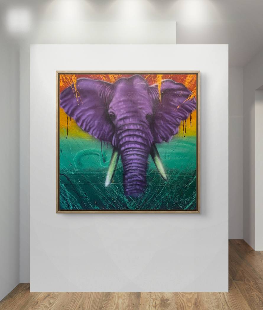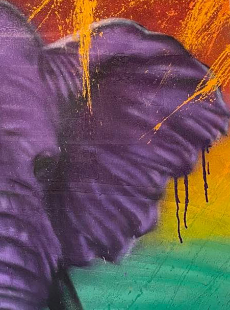 En majestætisk, violet elefant bøjer snablen ned i livets eliksir – et symbol på styrke, visdom og den kraft, der nærer livet og vores indre potentiale. Værket er skabt udelukkende med spraymaling, hvilket giver det sin eksplosive energi og farvedybde. Et visuelt løfte som spejler den modige handling i at sige ja til livet, midt i dets vildskab og skønhed.